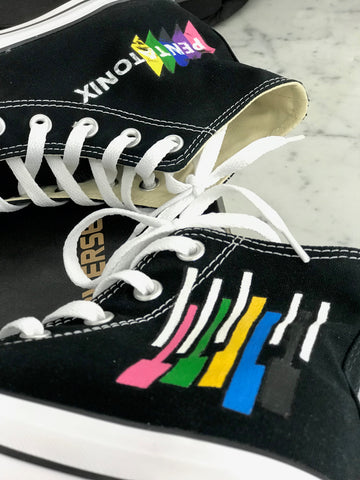 These were a request from a fan of the band Pentatonix ! We have painted the band's rainbow-style logo on both the outside of the shoes, giving them a rockin' vibe and continuous flare. "PENTATONIX" is written on the outside of the right shoe, overlapping the panels of color, making them look fun and color explosive!