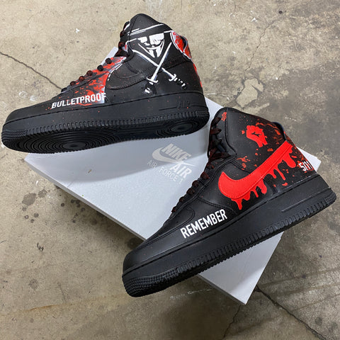 These shoes were custom made with the design theme surrounding the iconic 2005 dystopian film V for Vendetta. We painted Guy Fawkes mask and dagger on the outsides of each shoe. The "V" logo matches on both heels. Classic quotes from the film such as "Ideas are Bulletproof", "Remember, Remember", and "5/11" are seen through out the design on both shoes as well.